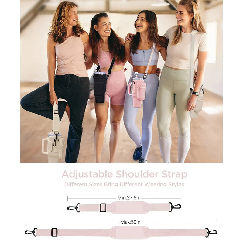 【Adjustable Shoulder Strap and Multiple Pockets】For Stanley Quencher 40 oz Cup Sleeve comes with a removable and adjustable padded shoulder strap, the shoulder strap can be easily adjusted between 27.5" and 50" to fit a wide range of body shapes. The water bottle holder for stanley 40 oz tumbler is designed with two front pocket designs that provide plenty of room for all your personal belongings such as smartphones, cash, cards,keys,etc.